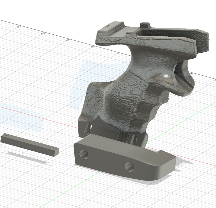 Jeg hadde ikke et slikt skjefte tilgjengelig så jeg lånte et skjefte av en kjenning og jeg scannet inn detaljene. Etter en del bearbeiding i et program som heter Fusion 360 fikk jeg tegnet om spesielt innfestingen til underhånds-støtten (noe som viste seg å ikke være helt enkelt) det denne nå festes med 2 M5x30 skruer.