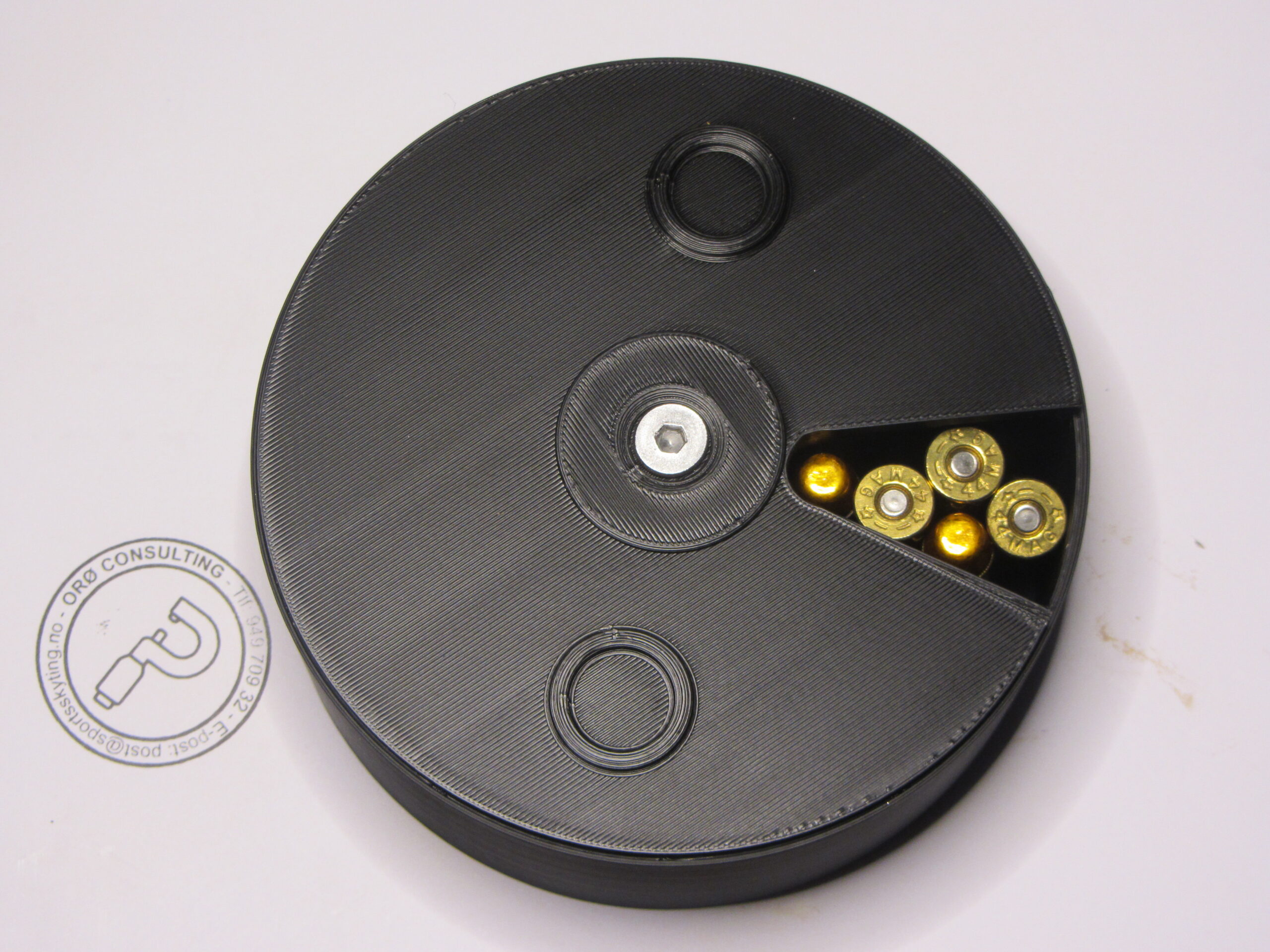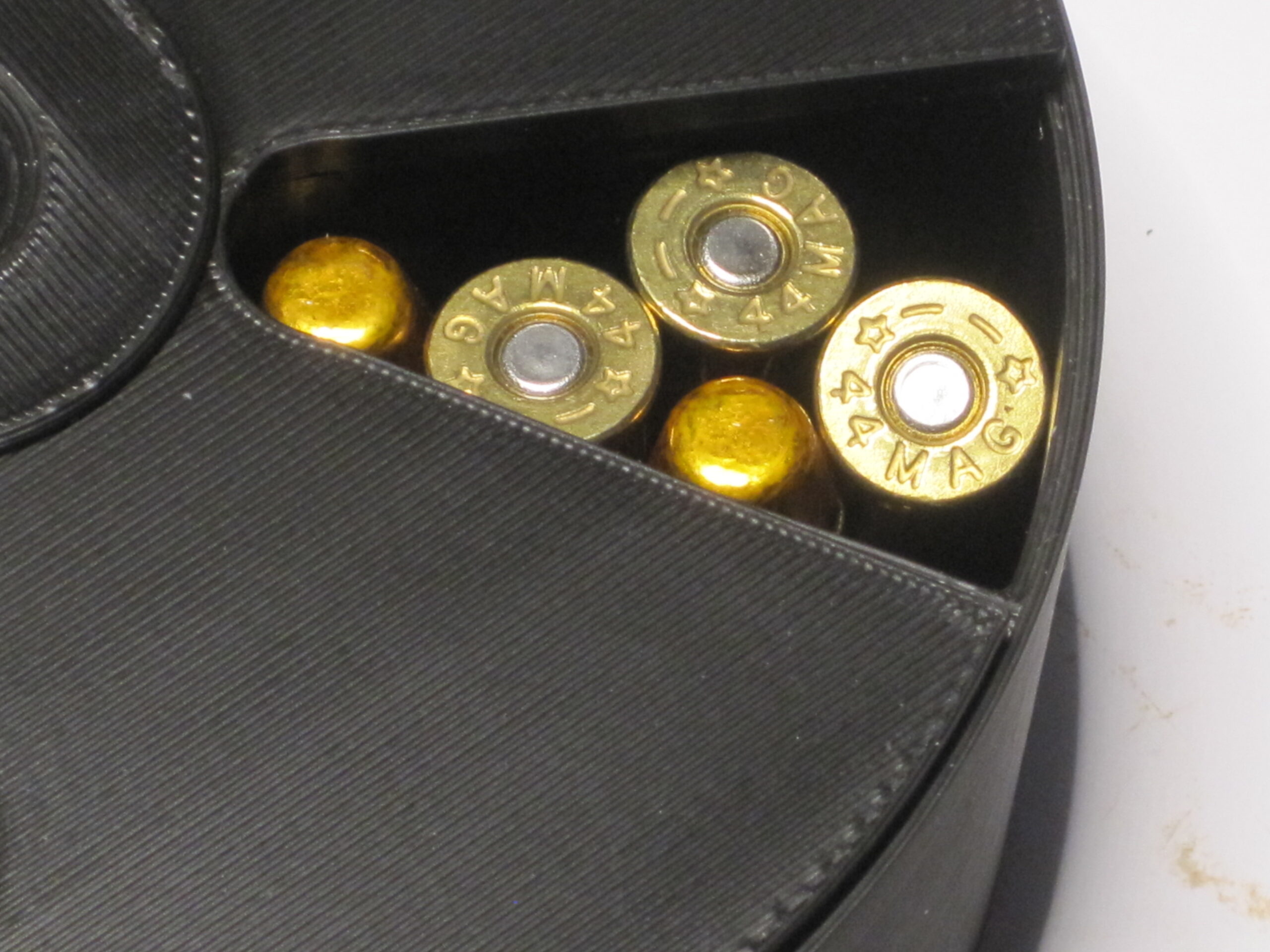 Snurreboks for patroner i cal .44 magnum/spesial. Boksen har 10 kammer (fjærbelastet stopp for hvert kammer) som rommer hver 5 patroner. Meget enkel å fylle – og å tømme.